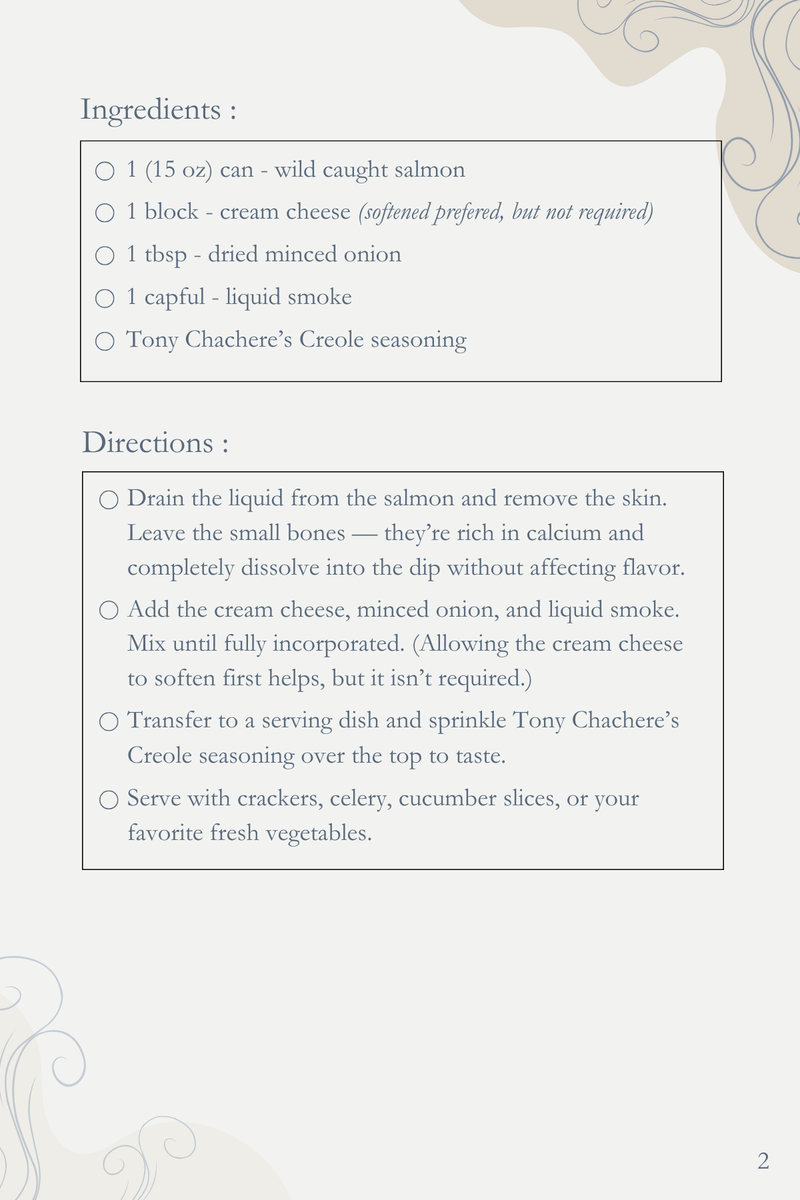 When we returned home, I didn’t have tuna in my pantry, but I did find a recipe for salmon dip from a friend tucked inside my recipe box.