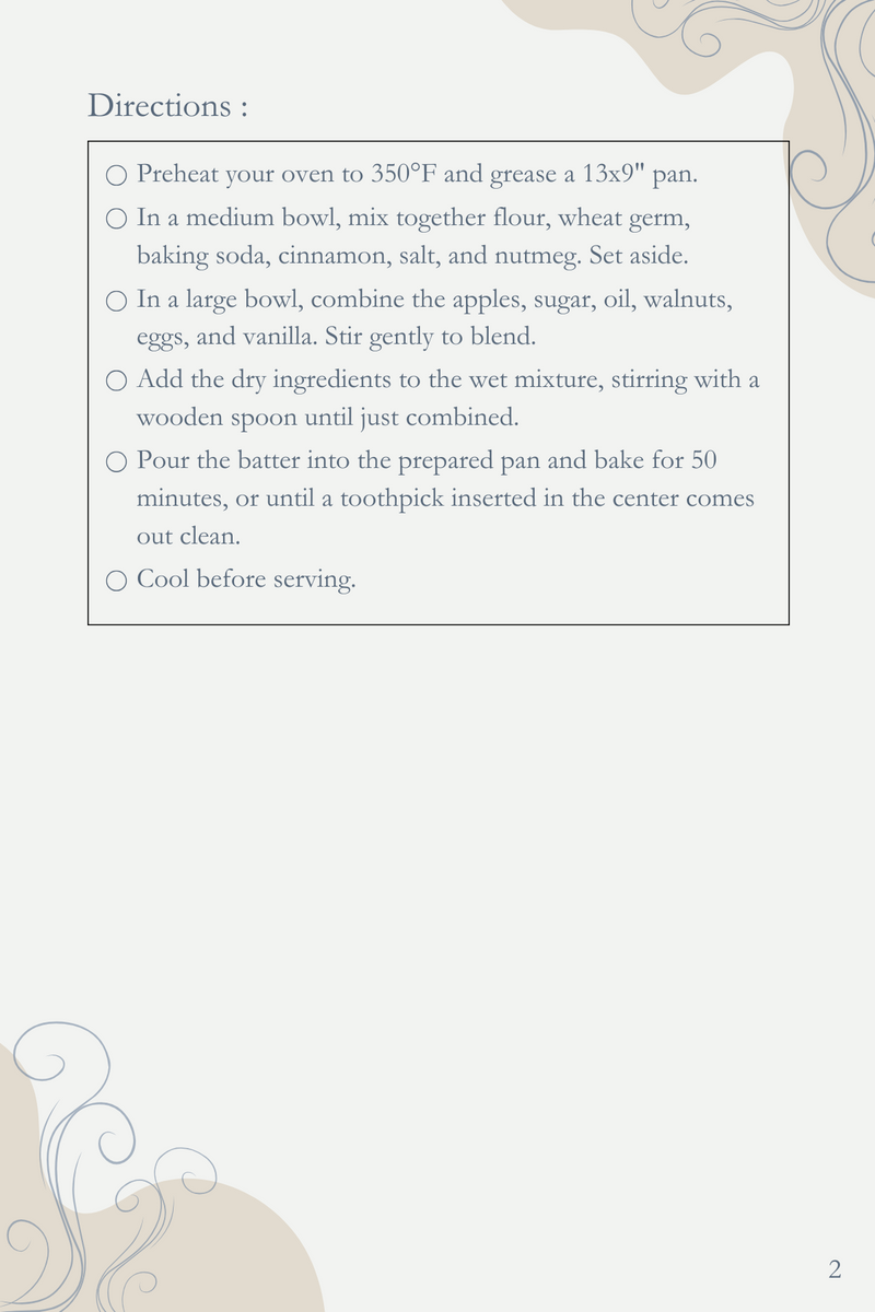 - In a medium bowl, mix together the flour, wheat germ, baking soda, cinnamon, salt, and nutmeg. Set aside.