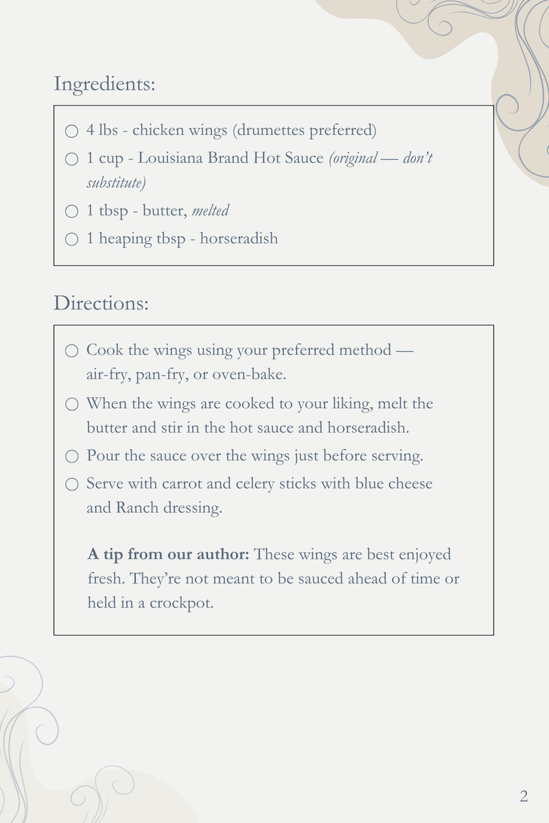 Cook the wings using your preferred method — air-fry, pan-fry, or oven-bake. When the wings are cooked to your liking, melt the butter and stir in the hot sauce and horseradish. Pour the sauce over the wings just before serving.