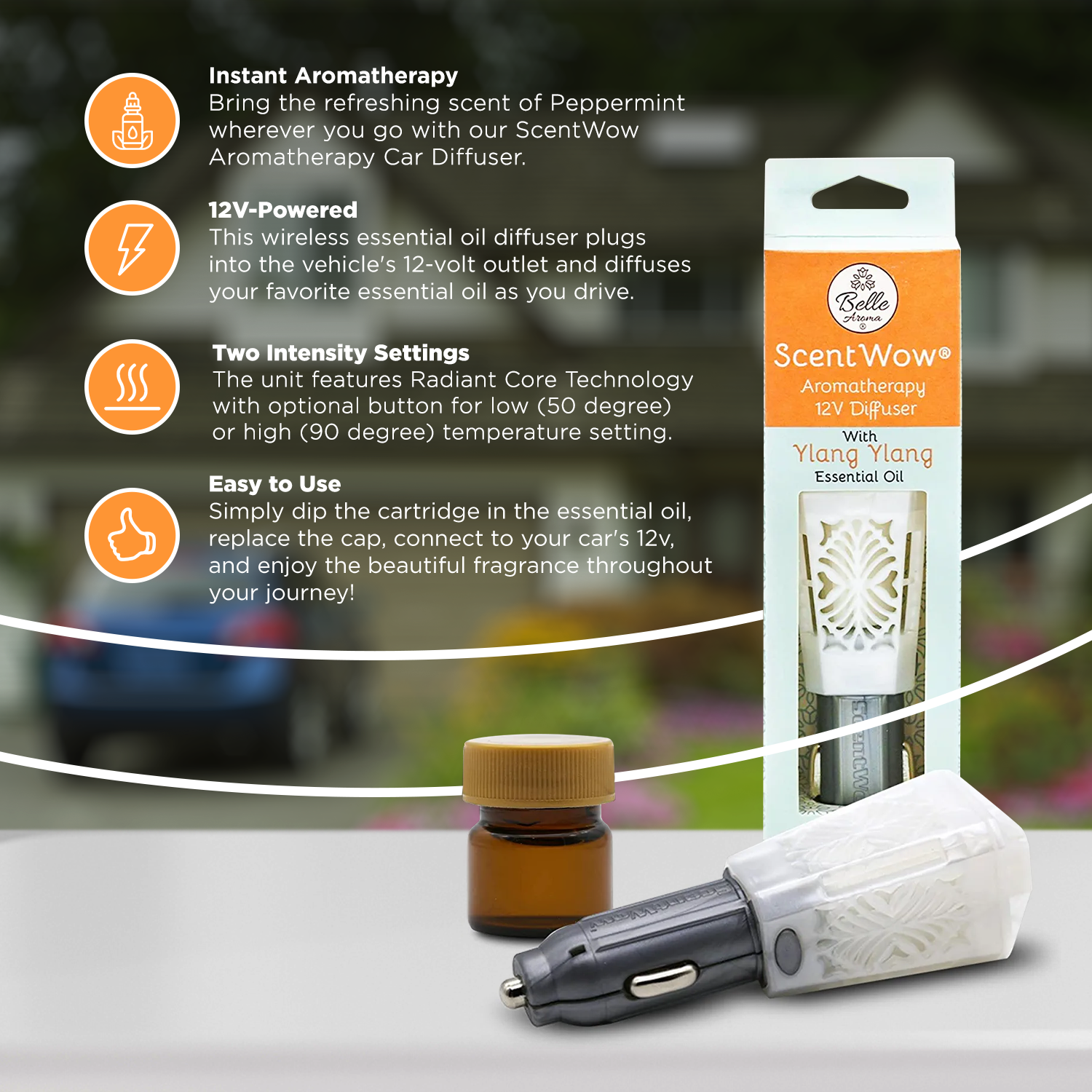The ScentWow® plugs into the vehicle’s 12-volt outlet to diffuse your favorite essential oil as you drive.